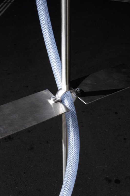 I rate pretty much all of my works equally important. It does not depend on whether it is about crafting, designing, writing, staging, or teaching. However, I have to stay disciplined to focus on what’s really relevant in the different projects. For example, for the “Flamingo Shower”, my project partner Maximilian David Graber and I asked ourselves what elements an easily demountable garden shower must consist of. We, then, elaborated a conscious expression for water-movement. Another installation that I am proud of and was able to work on with fantastic friends is “Runway Rain”. The rooftop terrace of a semi-public swimming pool in Lausanne was furnished temporarily with an automatic irrigation system and bags of earth to cultivate vegetables. We blurred the lines of productivity in the city and leisure along the shorefront, open to the public to participate. Part of the installation was a dinner-performance, where we ate the produce from the site. A third work that I recently finished is the dinner staging for my own wedding, where we crowded an empty helicopter hangar, placed a huge inflatable mirror-sphere, positioned a curvilinear-wandering table—where all our 120 guests could be seated at—, hung artificial spheres made of branches and moss-tendrils, and lit an orange-red light at the end of the night to demonstrate the fading day. Although just being a tiny part of my personal projects, they all contribute to my thinking and understanding of the world of design.
