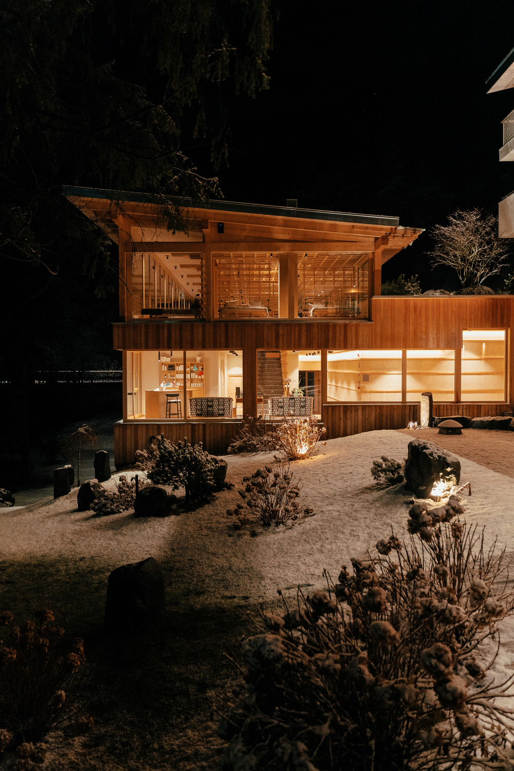 A light garden should emerge in the centre, adjoining all public areas such as the restaurant, library and bar. In addition, a 1,000 square metre bathhouse with a large wellness area was built. Surrounded by the Japanese-inspired garden, the floor-to-ceiling windows in the reading area and restaurant let in natural light and offer sweeping views of the natural surroundings.
