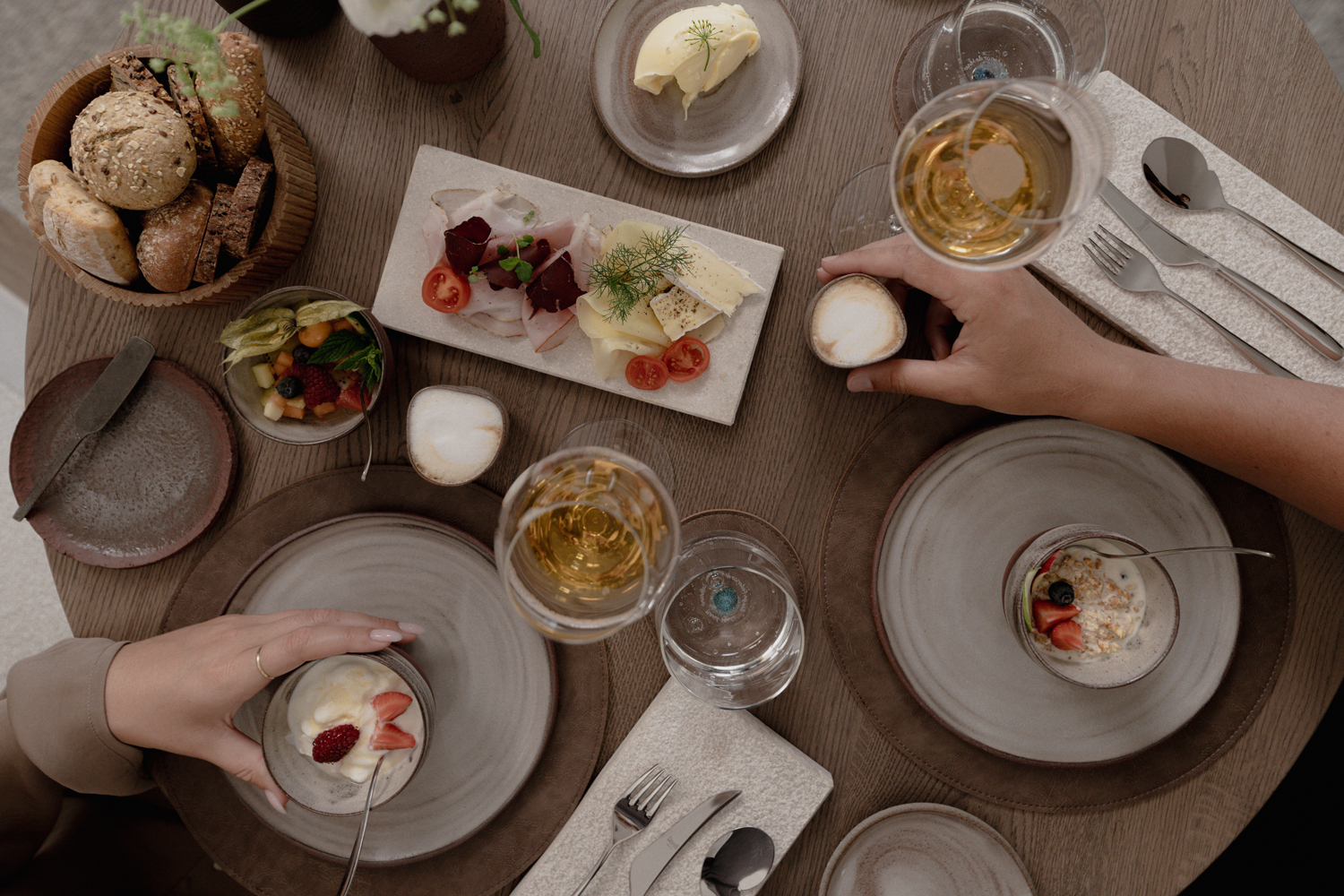 The stieg’nhaus serves breakfast with naturally friendly à la carte service until noon, and guests are welcome to stay for lunch until 1:30 p.m. In fact, the village of Mühlbach—and the entire region—has now gained a culinary hotspot. Maria and Tom developed the kitchen concept together with their team and refined it step by step. The work continues, with the aim of creating an experience that feels authentic, evolving, and deeply enjoyable. It is based on the elements of pasture, water, earth, fire, and nectar. The hoteliers are currently creating the dishes with the kitchen team. A glass of wine on the terrace, a leisurely brunch, an exclusive dinner—all of this becomes a sensual experience.